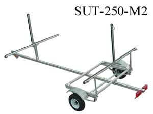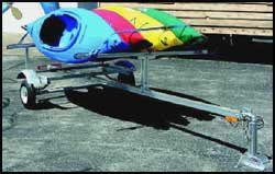 This trailer is designed for more than 1 canoe, kayak, or small boat. It has a carrying capacity of 250lbs. and has standard adjustable crossbars, with vinyl extrusions for that cushioned ride. 6 tie down loops and axle are adjustable.